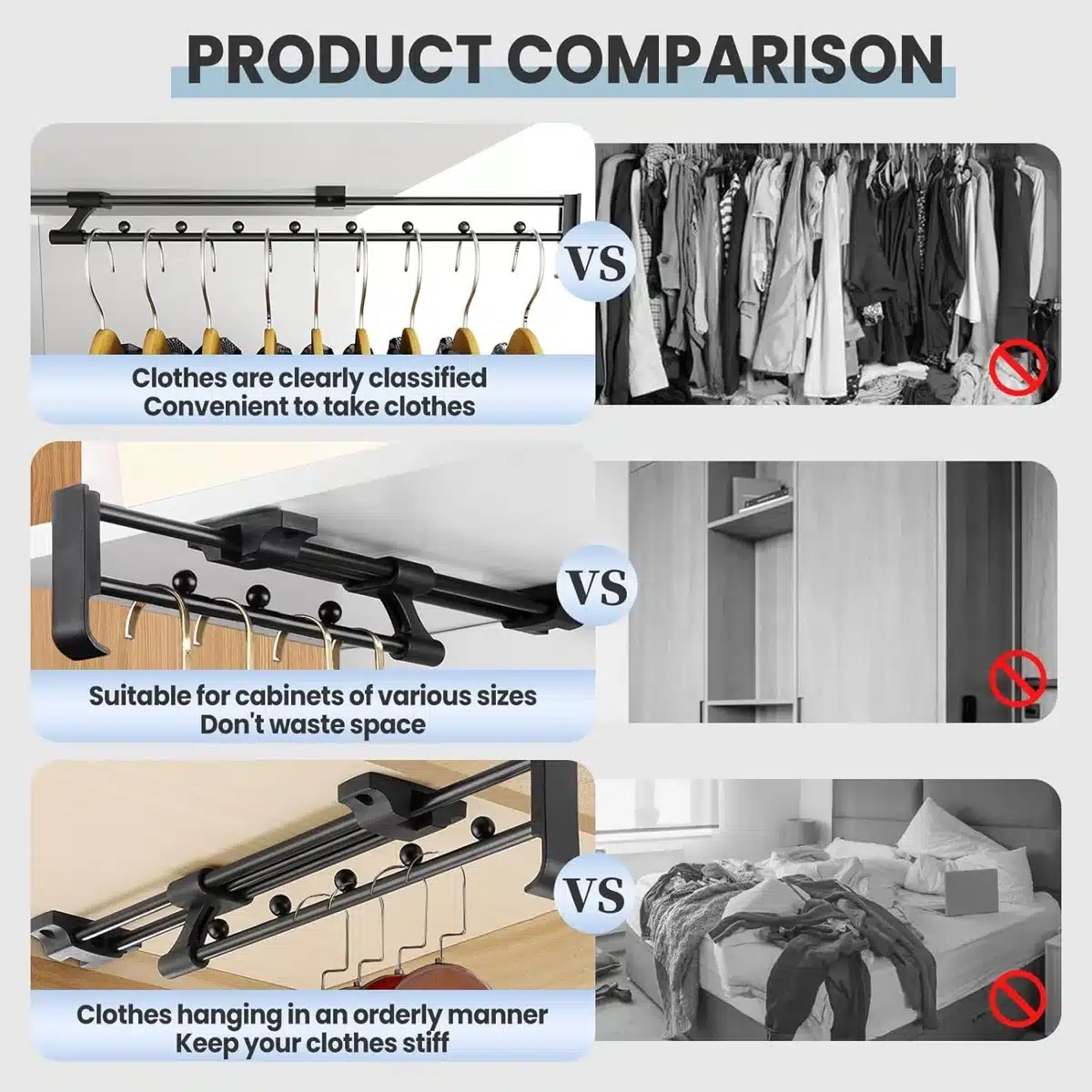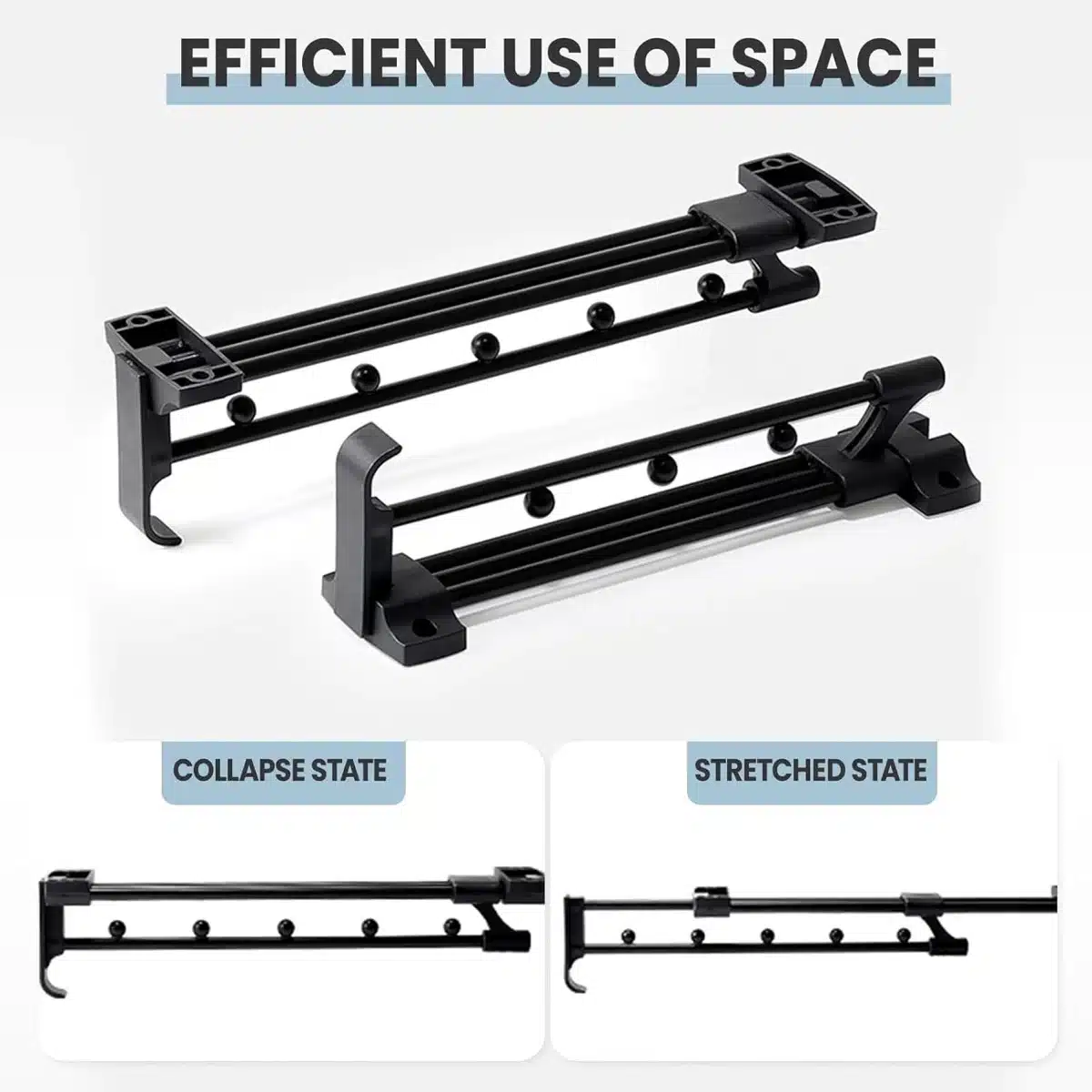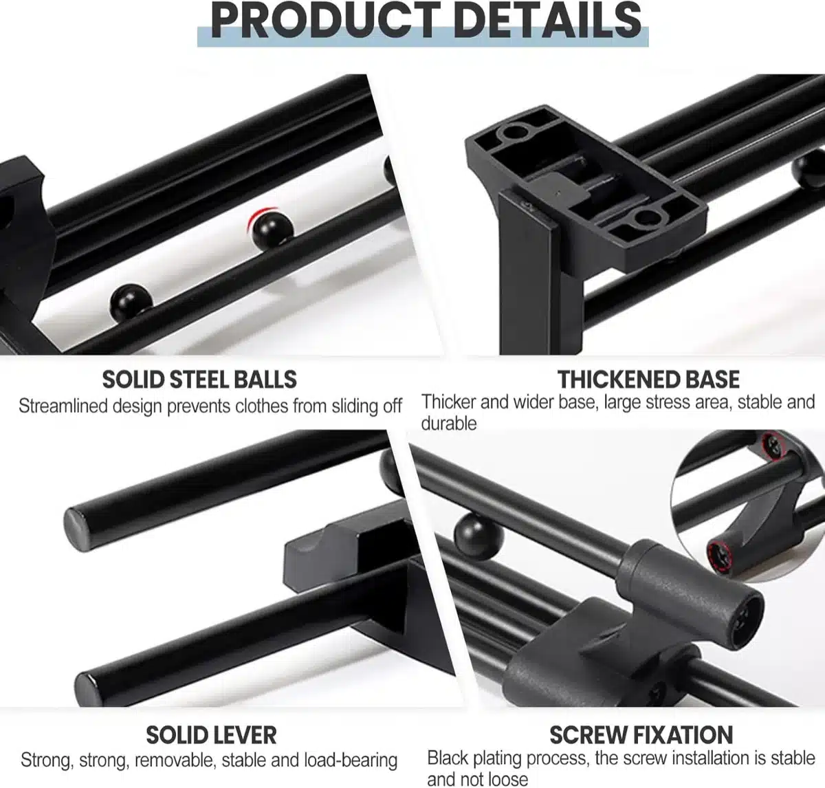 • Ločeni razdelki: vgrajeni separatorji na palici preprečujejo zbijanje obešalnikov in zagotavljajo enakomerne razmake med kosi oblačil.