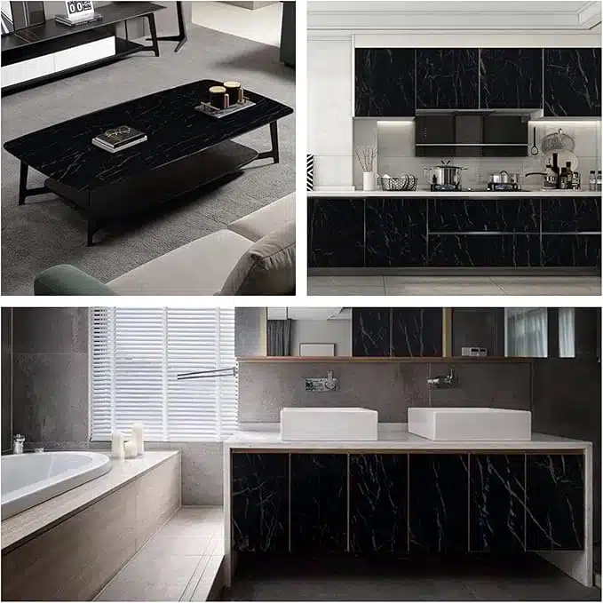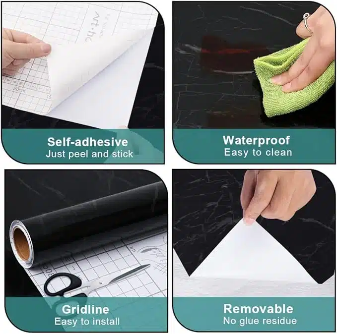 Samolepljiva črna marmorna folija je idealna za enostavno prenovo različnih površin. Nepremočljiva in olju odporna, omogoča hitro in enostavno namestitev brez dodatnega lepljenja. Popolna za pohištvo, pulti in stene, s preprostim rezanjem za popolno prilagoditev.