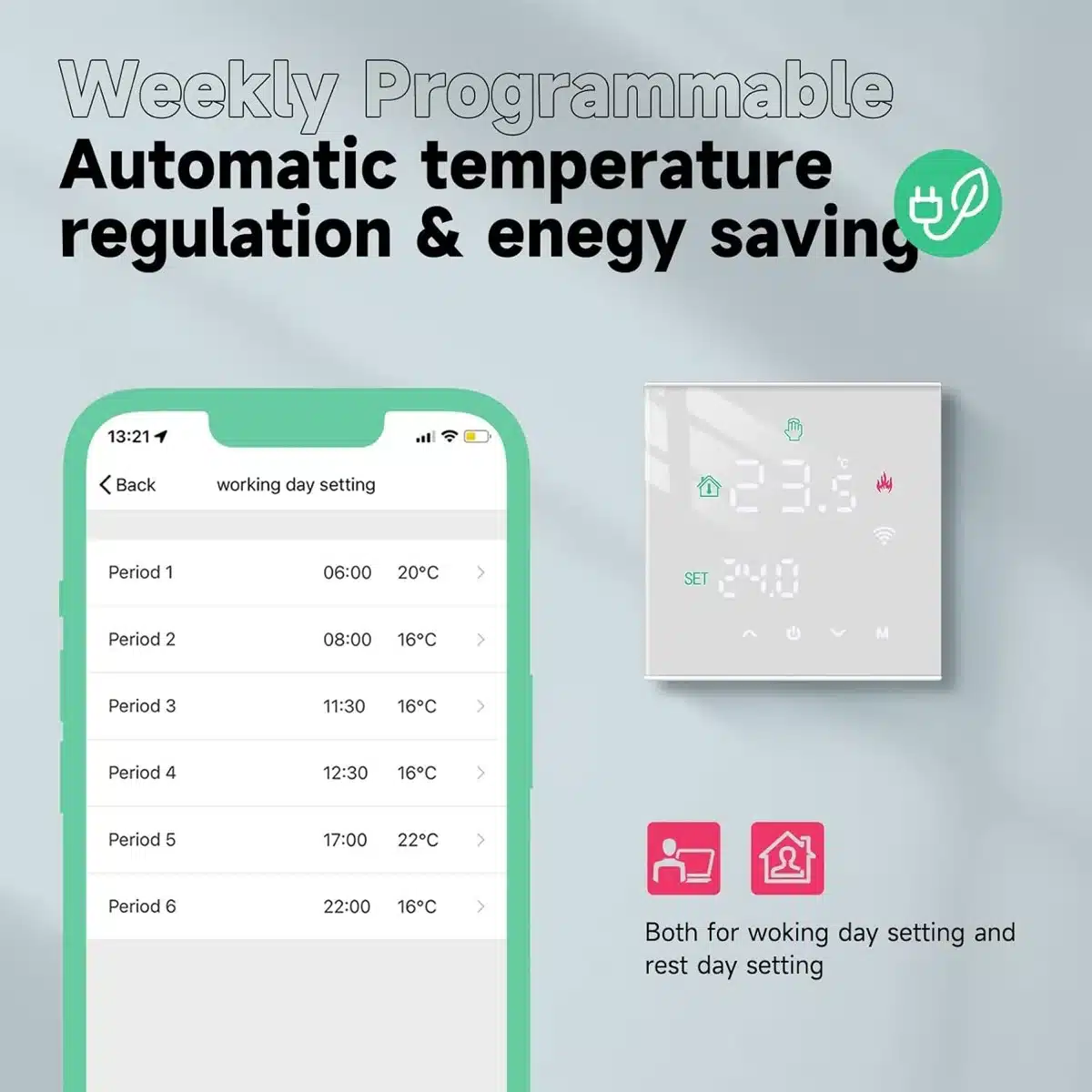 Termostat Beok odlikuje funkcija inteligentnega programiranja, ki vam omogoča nastavitev temperaturnih obdobij glede na vaše delovne navade in čas počitka, kar zagotavlja energetsko učinkovito delovanje brez nepotrebnega ogrevanja praznih prostorov. Naprava vključuje številne varnostne in napredne funkcije, kot so otroška ključavnica, zaščita proti zmrzovanju, temperaturna kompenzacija in spominska funkcija ob izpadu električne energije, ki ohrani vse vaše nastavitve. Eleganten bel dizajn s preglednim LCD zaslonom se diskretno vklopi v vsak interier, odzivno upravljanje na dotik pa omogoča hiter ročni poseg v nastavitve, ko je to potrebno. Montaža v standardno podometno dozo je hitra in preprosta s priloženima vijakoma, priložena podrobna navodila pa vas vodijo skozi celoten postopek povezovanja v omrežje. Z uporabo tega termostata boste imeli popoln pregled nad klimo v svojem domu, hkrati pa boste s pametnim prilagajanjem temperature dosegli znatne prihranke pri letnih stroških za energijo. Zaradi svoje zanesljivosti in možnosti oddaljenega dostopa je idealen tudi za vikende ali počitniške objekte, ki jih želite ogreti še pred svojim prihodom.