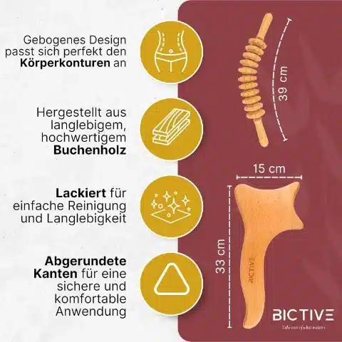 Kompakten komplet za maderoterapijo, namenjen zmanjševanju videza celulita in spodbujanju limfne drenaže. Izdelan je iz kakovostnega bukovega lesa ter primeren za masažo nog, zadnjice in hrbta.