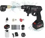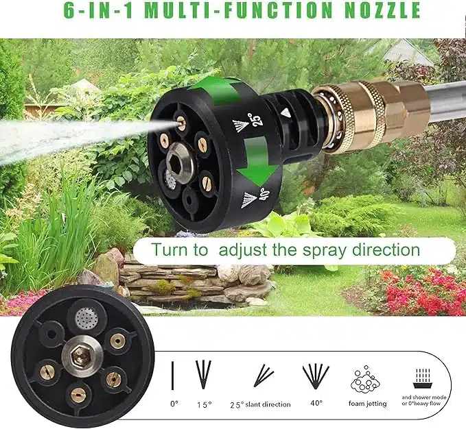 • 6-v-1 večnamenski pršilnik: Čistilec je opremljen z nastavljivim 6-v-1 pršilnikom, ki omogoča uporabo različnih načinov: 0°, 15°, 25° naklonski način, 40°, penasti curek in tuš način. S preprostim vrtenjem pršilnika lahko izberete želeni način, kar pripomore k večji varčnosti z vodo. Poleg tega je vključena tudi šoba z vsebnikom za detergent (približno 400 ml), ki je idealna za vsakodnevno čiščenje.