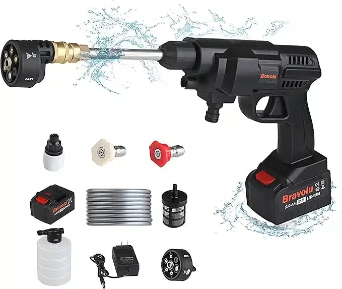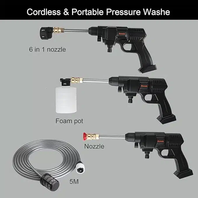 • Prenosni in brezžični visokotlačni čistilec: Z največjim delovnim tlakom 430 PSI in maksimalnim pretokom vode 5L/min je Bravolu brezžični visokotlačni čistilec dovolj močan za enostavno čiščenje zunanjih površin, vrtnarskih garnitur, avtomobilov, stopnic in umazanije okoli bazenov. Zasnovan je za uporabo z 21V litij-ionsko baterijo, kar omogoča mobilnost in enostavno uporabo.