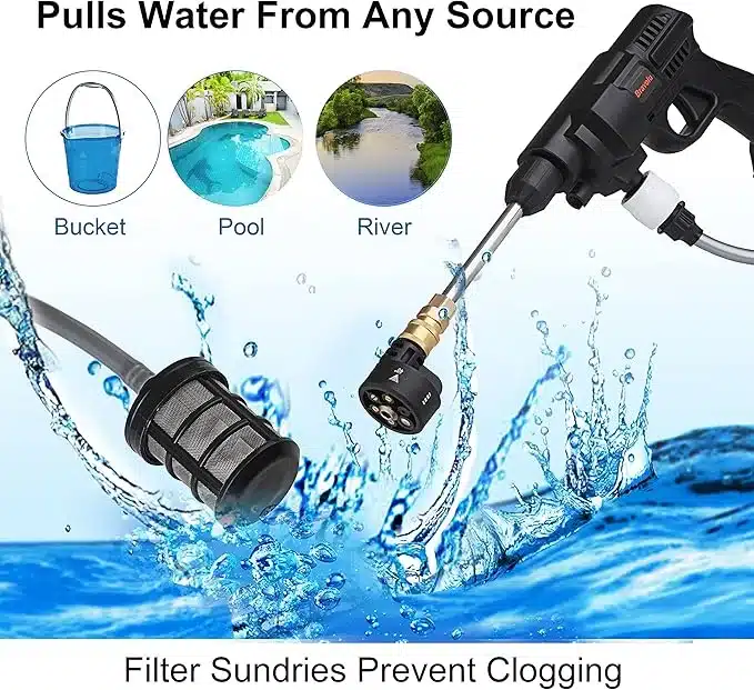 • Kompaktna in kakovostna zasnova: Dolžina cevi je 200 cm in vključuje filtrirno košarico, ki učinkovito odstranjuje nečistoče, delce, liste in blato, kar zaščiti napravo. V primerjavi z običajnimi visokotlačnimi pralniki je Bravolu brezžični čistilec lažji in bolj prenosljiv, kar omogoča enostavno prenašanje. Zasnovan je za hitro montažo, brezskrbno uporabo, ter ga je možno priključiti tudi na plastenko.