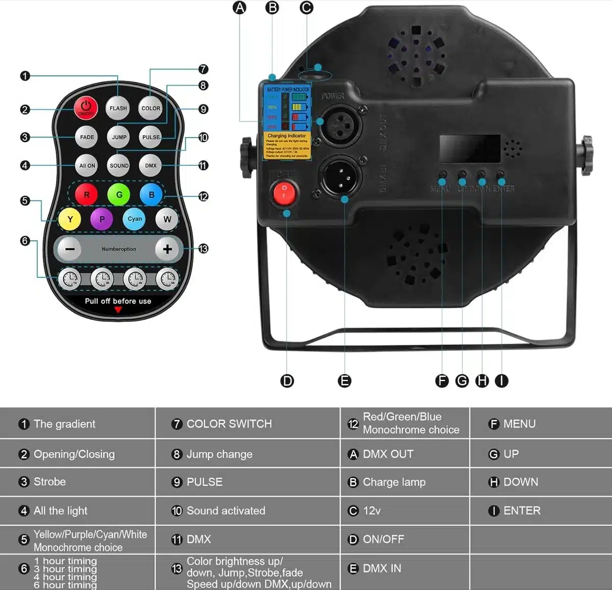 Zmogljiv RGBW LED PAR reflektor z vgrajeno baterijo 5500 mAh omogoča brezžično osvetlitev za oder, poroke, zabave ali zunanje dogodke. Opremljen je z 12 LED diodami 4-v-1 (RGBW) in ustvarja intenzivne barvne učinke, prehode ter stroboskop. Upravljanje poteka preko daljinskega upravljalnika z možnostjo časovnika.