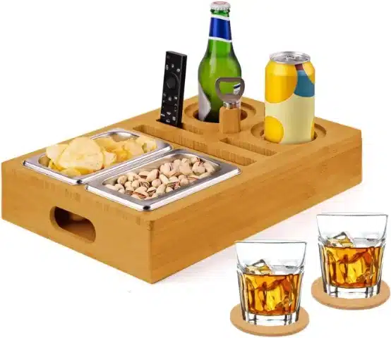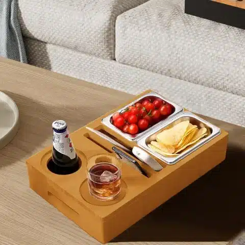 Praktičen kavni bar iz bambusa omogoča organizirano shranjevanje prigrizkov, pijače, mobilnih telefonov ali daljinskih upravljalnikov. Komplet vključuje dve odstranljivi posodici za prigrizke in dva podstavka, kar olajša uporabo doma ali na prostem.