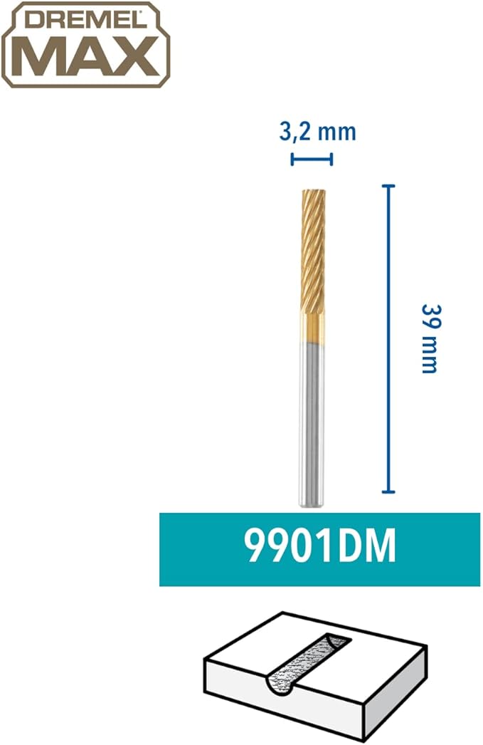 Rezkar Dremel 9901DM MAX je izdelan iz karbidne trdine in prevlečen s titanovo nitridno plastjo, kar zagotavlja do 2-krat daljšo življenjsko dobo v primerjavi s standardnimi nastavki. Omogoča natančno obdelavo kovin, keramike, lesa, plastike in drugih trdih materialov. Primeren je za vsa večnamenska orodja s premerom stebla 3,2 mm.