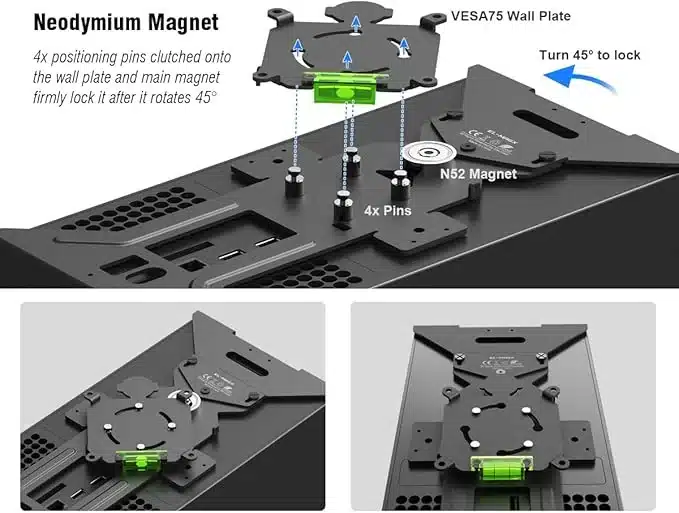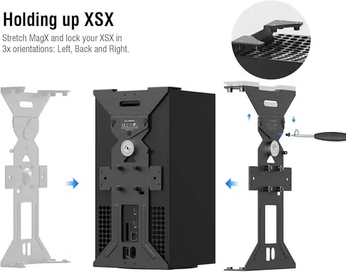 Magnetna montaža za Xbox Series X, ki omogoča flexibilno montažo v različnih položajih. Namestite jo vertikalno ali horizontalno, prihranite prostor in zagotovite optimalno hlajenje.