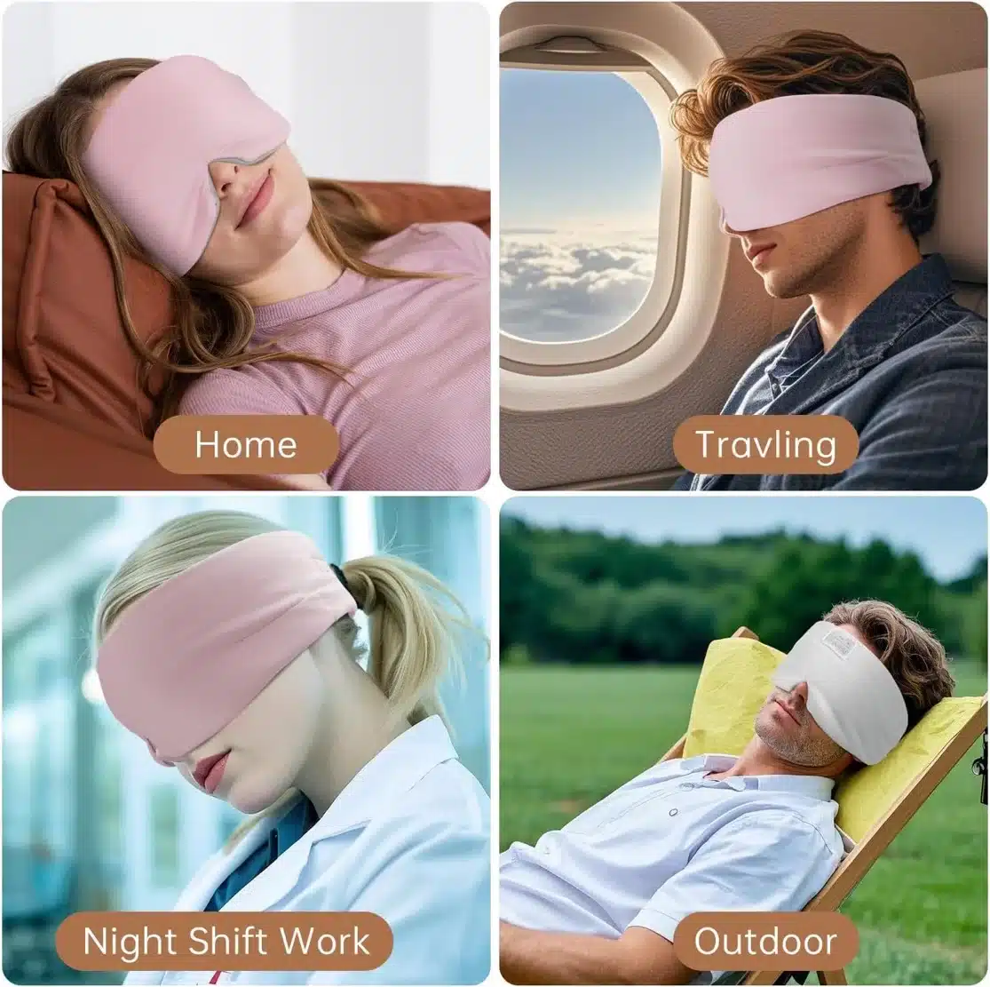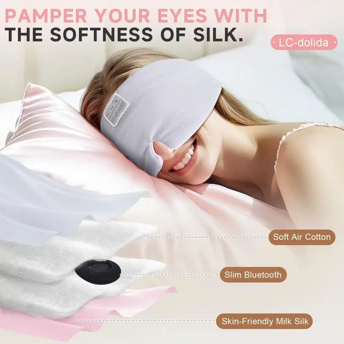 Ta svilnata spalna maska z vgrajenimi slušalkami Bluetooth zagotavlja popolno zatemnitev in izjemno udobje med spanjem, potovanji ali počitkom. Izdelana je iz vrhunske mulberry svile 6A, ki je prijetna, zračna in nežna do kože.