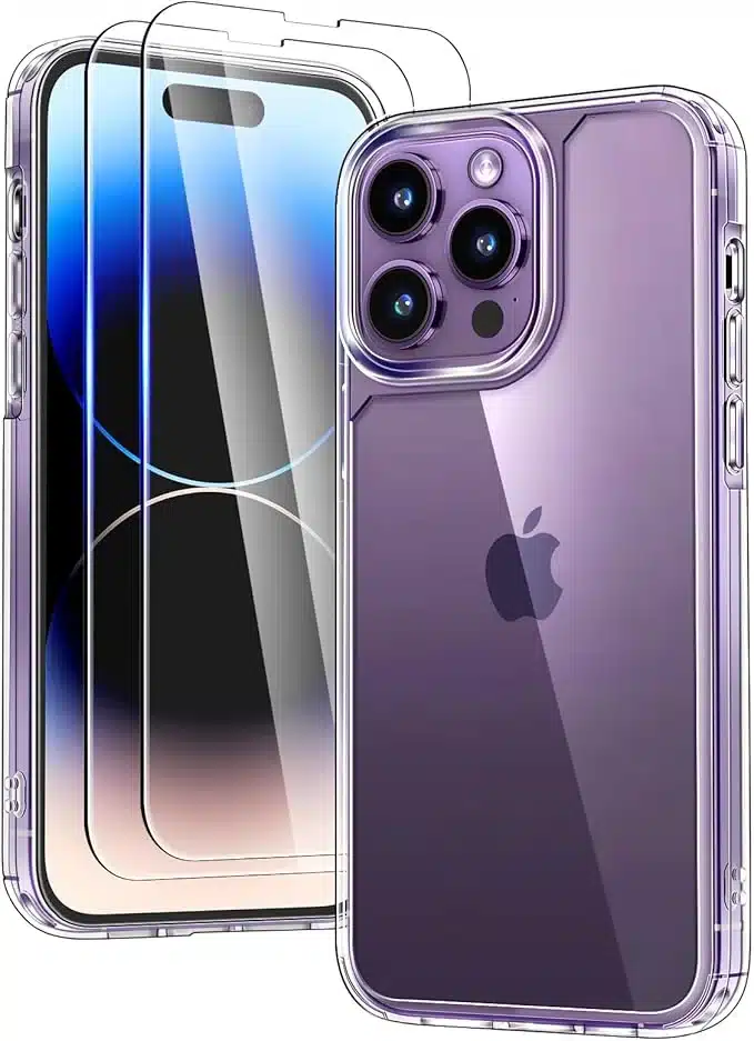 TAURI 5-v-1 ovitek za iPhone 14 Pro zagotavlja 360° zaščito z 9H kaljenim steklom, zračnimi blazinami za udarce, kristalno jasnim in odporen na porumenjenje materialom ter udobnim dizajnom za enoročno uporabo.