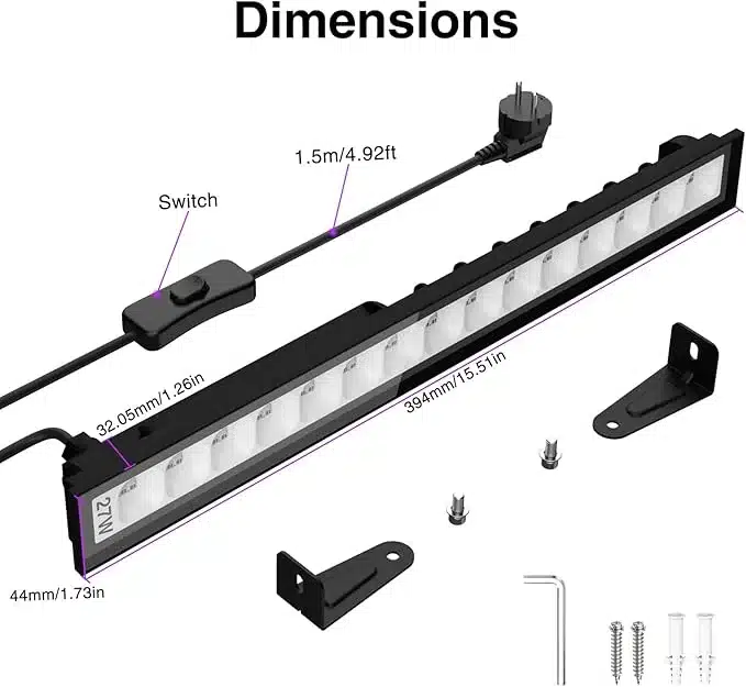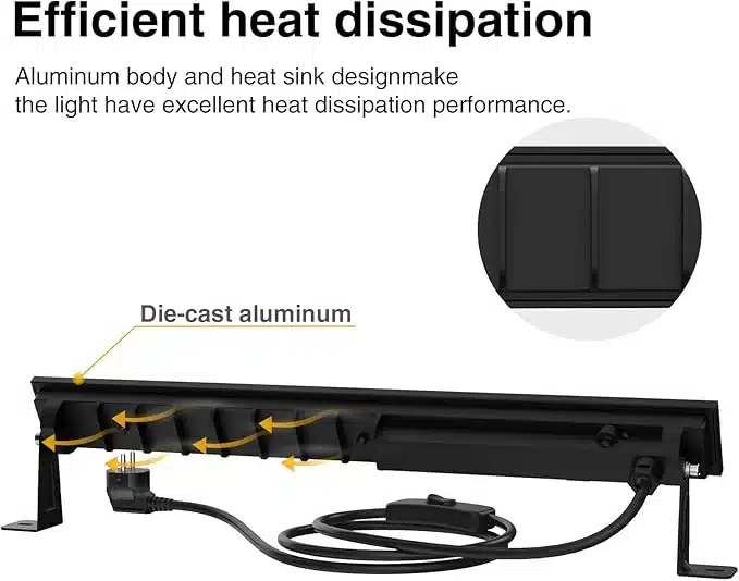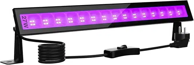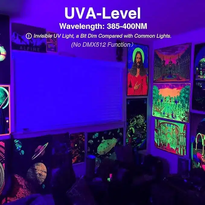 UV svetilka s 48 LED diodami omogoča širok svetlobni kot in pokriva do 50 m². Idealna za dekoracije na zabavah, z varno UVA črno svetlobo in vodoodporno zaščito za zunanjo uporabo.