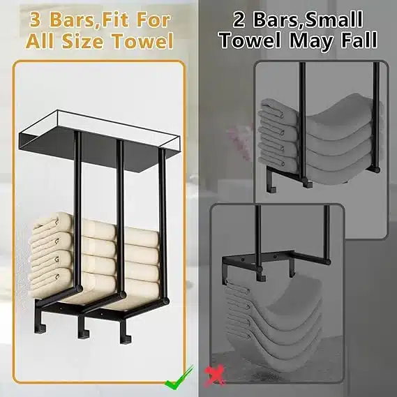 3 palice, zgornja polica, kompaktna zasnova. Učinkovita rešitev za organizacijo brisač in kopalniških dodatkov. Popolna izbira za majhne kopalnice, hotele ali SPA prostore.