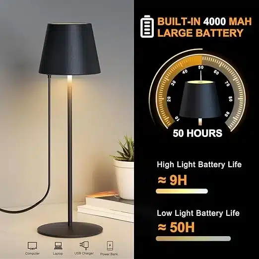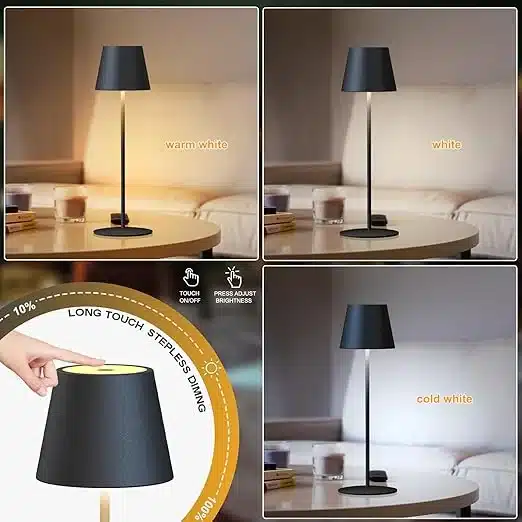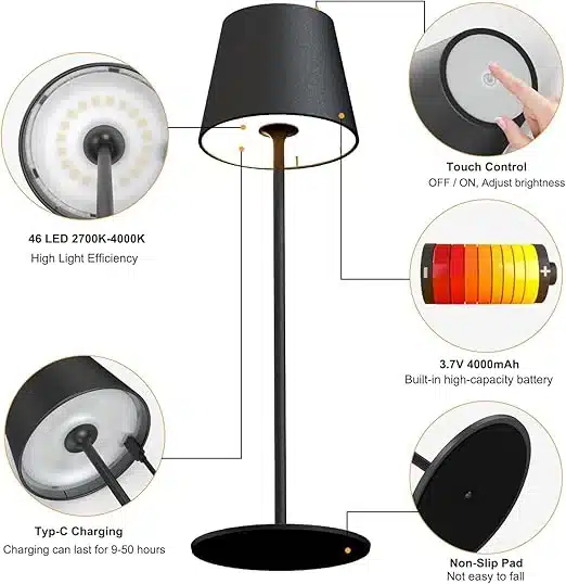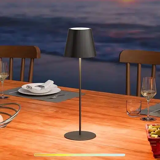 Brezžična LED namizna luč z nastavljivo svetlostjo in barvo. Primerna za notranje in zunanje prostore, z dolgo življenjsko dobo in IP54 zaščito pred vodo.