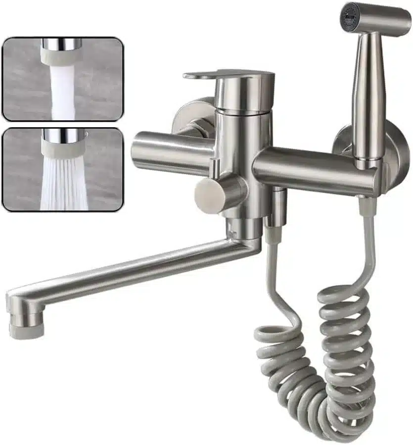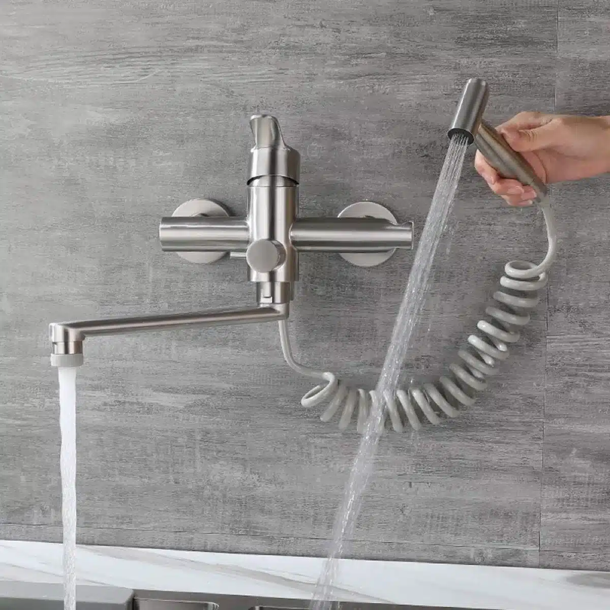 • Dvojna funkcionalnost: sistem vključuje klasičen vrtljiv izliv in dodatno pršilno pištolo za hitro in učinkovito izpiranje pod pritiskom.