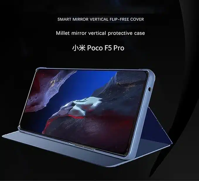 Eleganten Tncavo ovitek za Xiaomi Poco F5 Pro z vgrajenim ogledalom in funkcijo stojala. Ponuja izjemno zaščito pred praskami in udarci, ter omogoča udobno gledanje videov ali snemanje selfijev