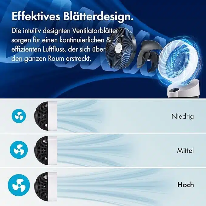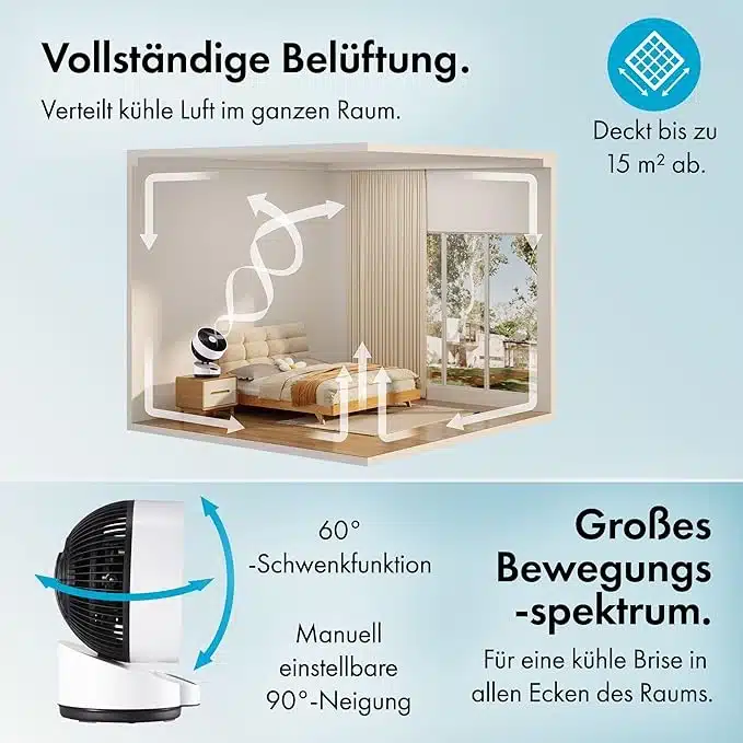Tihi konvekcijski ventilator z več načini in funkcijo nagiba ter vrtenja. Preprosto upravljanje z daljinskim upravljalnikom in 12-urnim časovnikom za optimalno hlajenje!