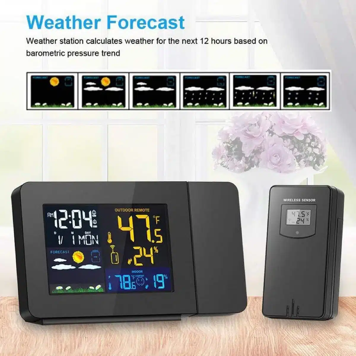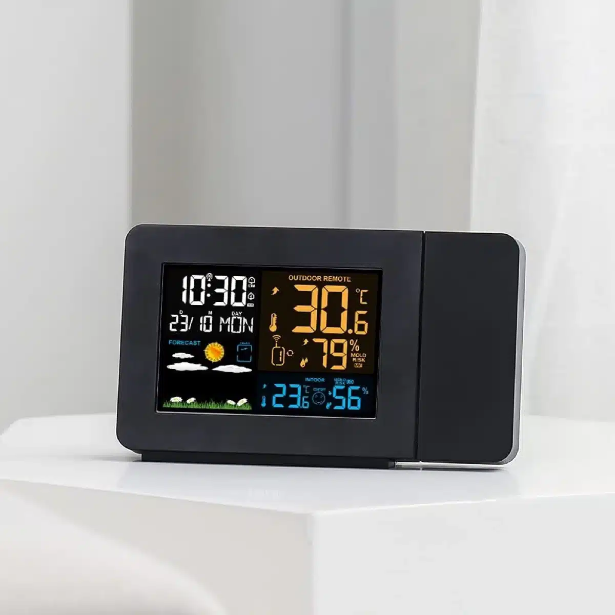 Večnamenska brezžična vremenska postaja s projekcijsko uro omogoča natančno spremljanje notranje in zunanje temperature ter vlage. Opremljena je z DCF radijsko uro, projekcijo časa na strop ali steno ter vremensko napovedjo. Primerna je za uporabo doma, v pisarni ali na vrtu.