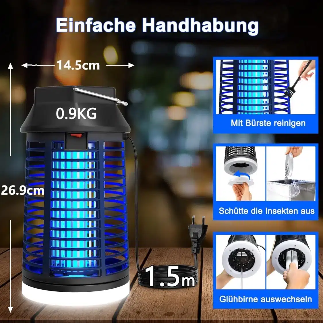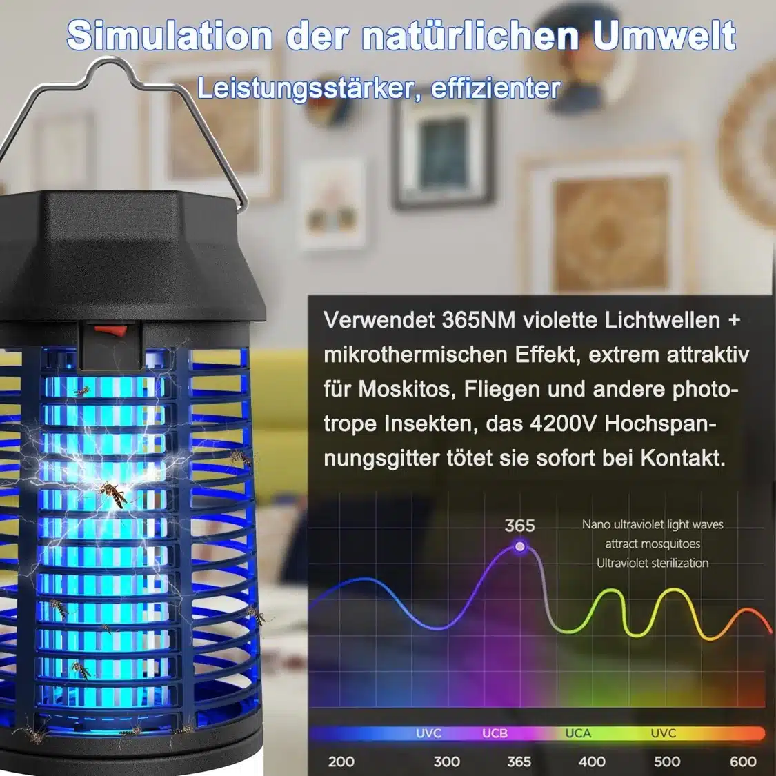 Električni uničevalec insektov deluje z močnim UV-svetilom 15 W in visokovoltno mrežo 4200 V za hitro in učinkovito odstranjevanje komarjev, muh ter moljev. Primeren je za notranjo in zunanjo uporabo, vključuje daljinski upravljalnik za udobno upravljanje na daljavo.