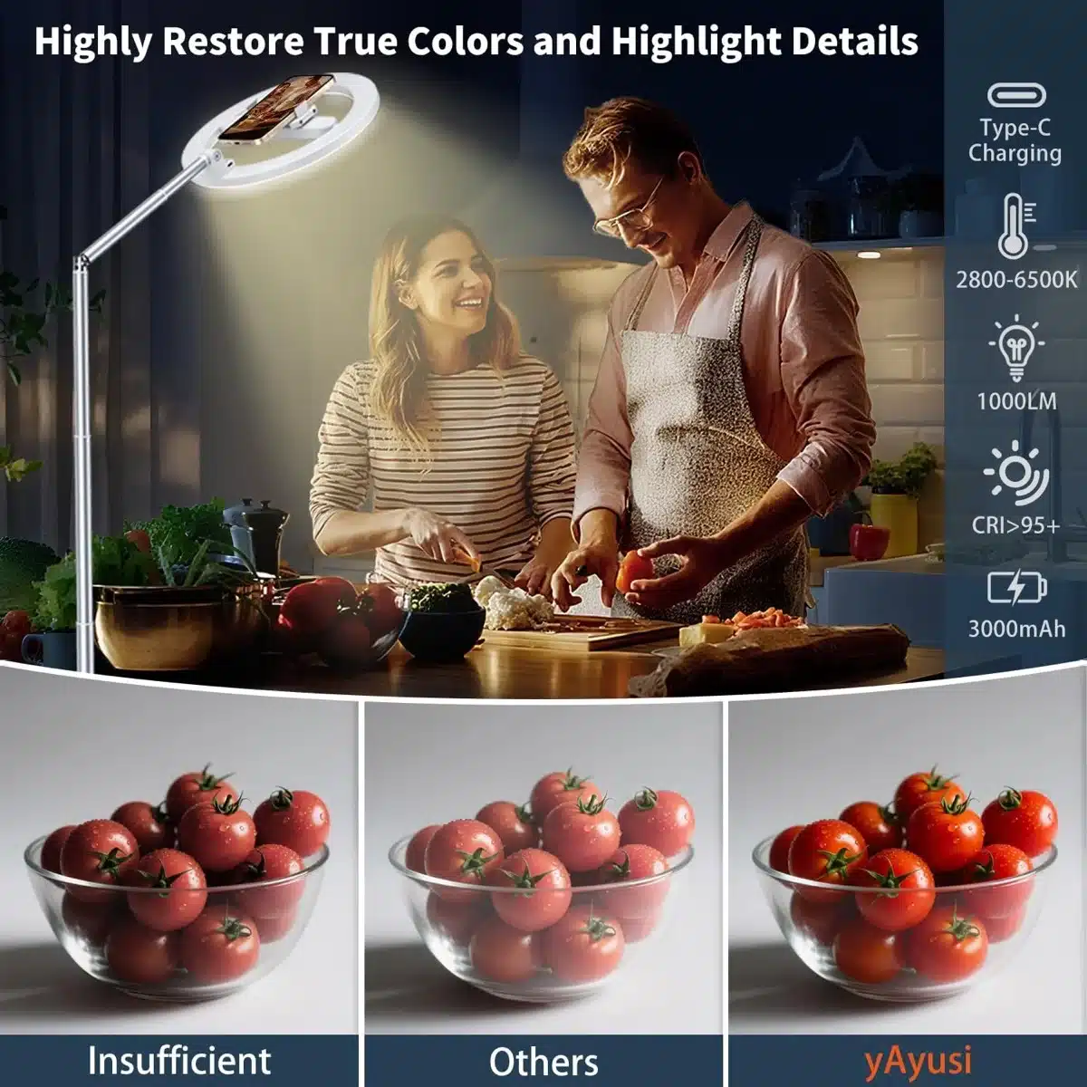 • Prilagodljiva svetloba: trije barvni načini (2800–6500 K) in pet stopenj svetlosti omogočajo naraven videz kože in okolice.